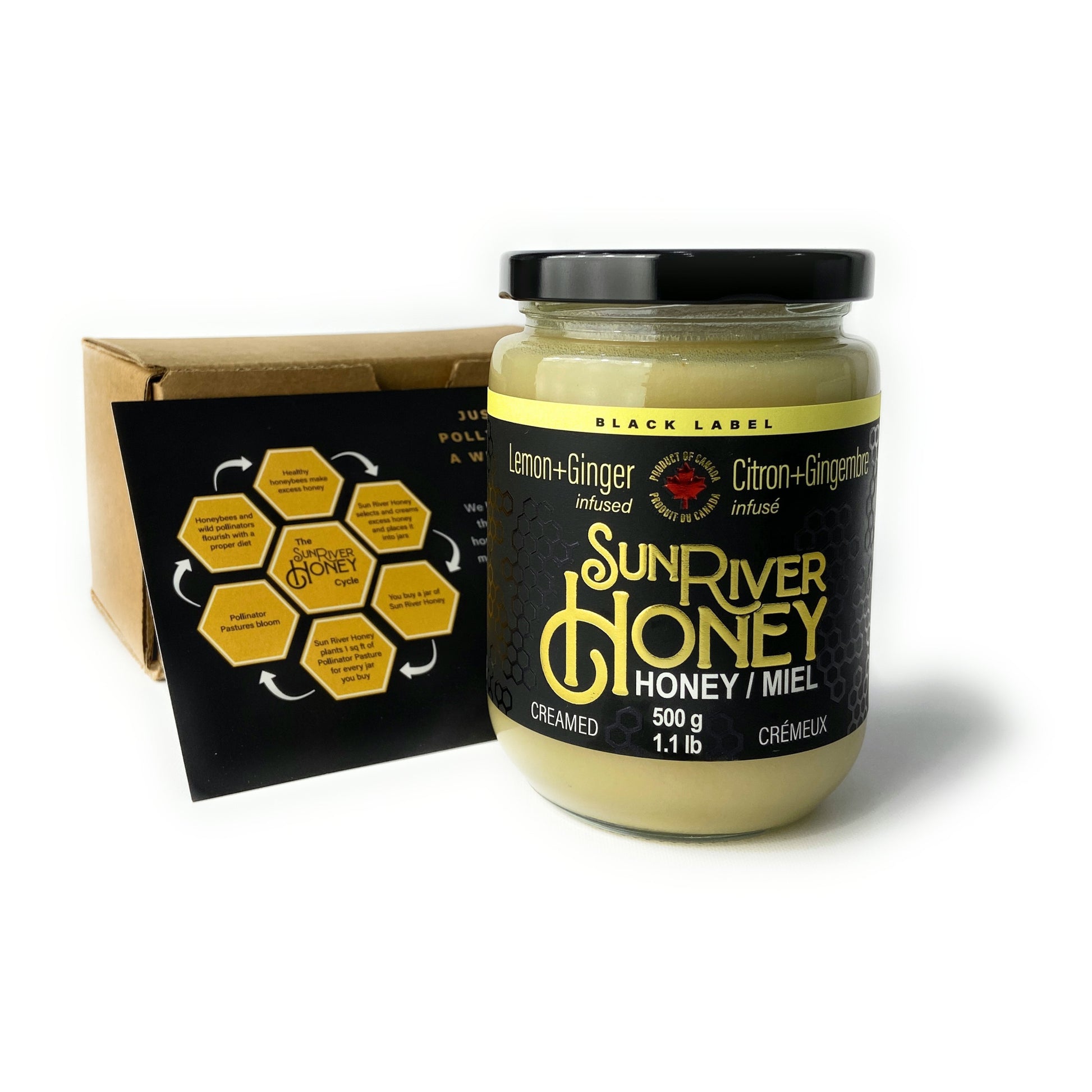 Lemon + Ginger infused honey combines our proprietary soft creamed Black Label honey with real lemon and organic ginger. Like all our Black Label honey, our Lemon + Ginger infused honey is unpasteurized, always soft and spreadable, and always contains its natural pollens.